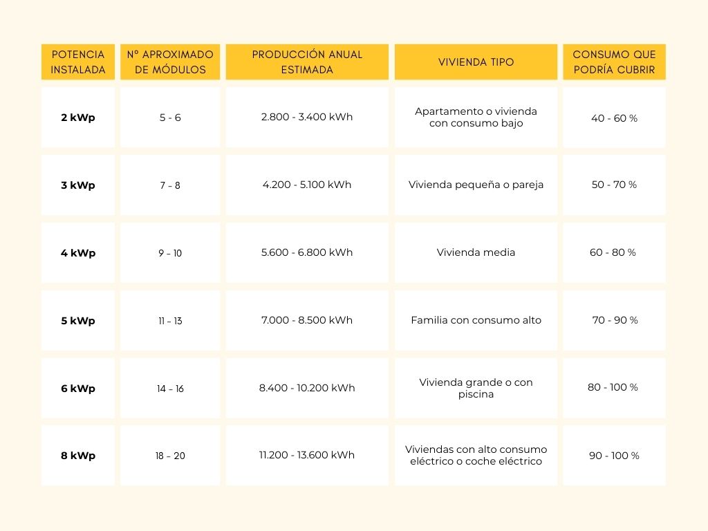 Como referencia, una vivienda media en España suele consumir entre 3.000 y 4.000 kWh al año, por lo que una instalación bien dimensionada puede cubrir una parte muy importante del consumo anual.
